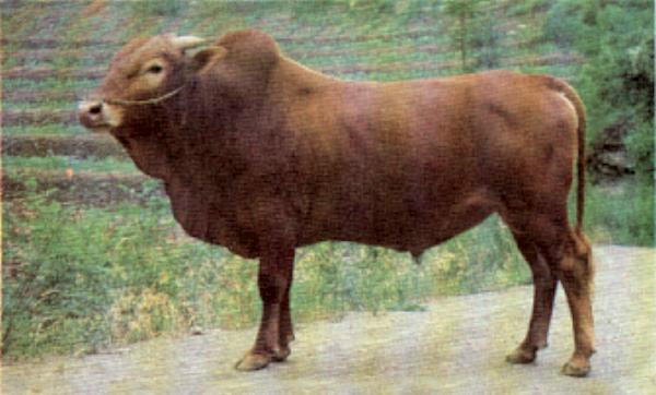 | 体貌概述 | 头大小适中,额宽微凹。龙门角和芋头角较多,扁担角和羊叉角次之。眼大、眼圈白色居多,黑色较少。嘴方圆,鼻孔大。鼻镜黑色较多,粉红色次之,其余均为黑斑点。公牛颈粗短,垂皮发达,鬐甲高,肩峰呈馒头状;母牛头清秀,颈细长,肩峰低。背腰平直,肋骨开张,腹圆大,不下垂。尻部稍斜,肌肉发达。十字部公牛低于鬐甲部,母牛高于鬐甲部。毛色红黄者居多,黑和烟熏等色次之,四肢内侧毛色较淡,背线明显。公牛睾丸发达。母牛乳房发育尚好。四肢粗短,关节明显,蹄圆而大,形如木碗。蹄质坚硬,蹄缝紧,蹄色有黑色。黄色和筋蹄(黄白相间)三种,以前一种居多。公牛皮厚毛短有弹性,母牛皮薄而紧凑。 | 体型 | 公牛颈粗短,垂皮发达,鬐甲高,肩峰呈馒头状;母牛颈细长,肩峰低。背腰平直,肋骨开张,腹圆大,不下垂。尻部稍斜,肌肉发达。十字部公牛低于鬐甲部,母牛高于鬐甲部。四肢粗短,关节明显。 |