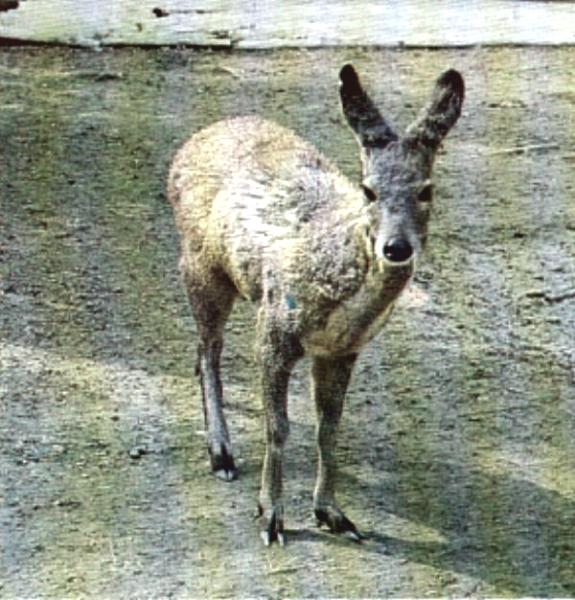 | 体貌概述 | 公母均无角。公麝上犬发达,为獠牙;母麝上犬齿短小,一般不露出唇外。耳大直立,眼大有神。臀部比肩部高。公麝脐与阴囊之间有麝香囊,向体外有一开口,为麝香囊口。头部毛为黑褐色,眼后下方有两道延至下颌。耳背黑色或褐色,耳内白色。颈下有形似“小”字状的斑纹,向后又有两条白带在前胸会合为一条宽带直至腋下。颈背、颈侧、体背、体侧多呈橄榄褐色。腹面多为黄褐或灰褐色,乳区土黄色。四肢前面麻褐色,后面及蹄甲多黑色。 | 体型 | 臀部比肩部高。 |