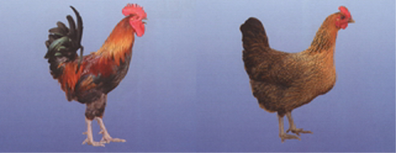 母鸡分黄麻和黑麻两种类型,单冠,公鸡色彩鲜艳,羽毛棕红色,尾呈绿色,腹胸部羽毛红中带黑,单冠直立,体形或菱形。该鸡体型中等,呈菱形,喙青色,单冠,冠齿6-7个,冠,肉髯、耳叶、脸红色。 |
