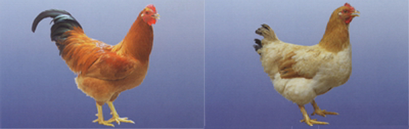 胸深,体躯长方形。头稍大,喙、皮肤,脚黄色。分大、小两型。大型体大骨粗、脚高。小型鸡体小、骨细、脚矮。单冠直立,喙呈黄褐色,耳垂、肉髯鲜红色。公鸡羽色鲜艳,头颈羽毛金黄色,尾羽有短尾羽和长尾羽两种类型。母鸡羽毛多为全身黄色,胫、趾 |