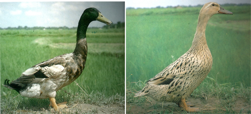 体型较小,肩较狭。背平直。体躯稍长且向上抬起。头清秀,喙石青色,胫、蹼橘黄色。全身羽毛紧密。眼上方有长眉状白羽。公鸭头颈羽毛有翠绿色光泽,前胸、背腰部羽毛红褐色,尾部淡灰色。母鸭头颈羽毛多呈泥黄色。背腰部羽毛以泥黄色为底上缀黑色色 |