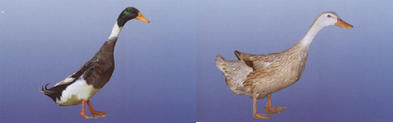 体格较小,体躯较长,羽毛紧凑,头清秀,喙呈橙黄色,喙豆为乌色,虹彩黄褐色,眼突出明亮,颈细长昂起而灵活,胸突出,背宽大,腿短粗。跖、趾、蹼多为橘红色,毛色麻褐色居多,胸部和腹部为土黄色或白色。 |
