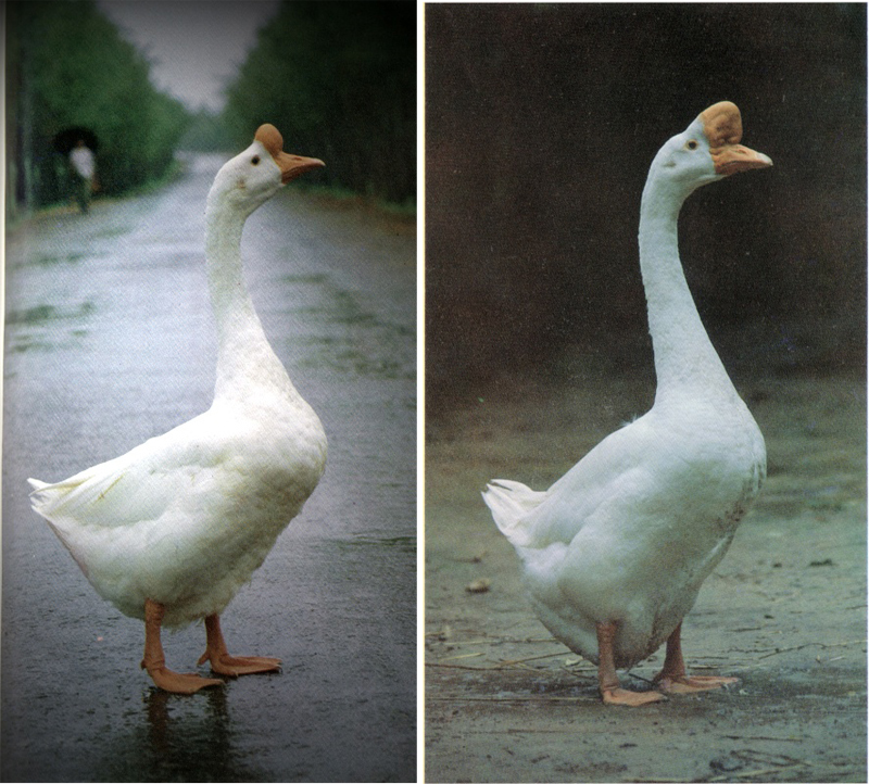 体型中等,体态高昂,颈长呈弓形,胸深广,背宽平。全身羽毛白色,绒羽厚密,产绒量高,头顶有橘黄色肉瘤,圆光滑无皱褶,喙橘黄色,虹彩灰蓝色,胫、蹼橘红色,爪白色。公鹅肉瘤大而突出,颈粗长有力;母鹅颈较细短,腹部微下垂。 |