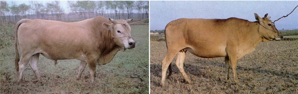 体型中等偏大。结构匀称,皮薄毛细,骨骼较粗壮,肌肉发达结实。毛色以浅黄、红、草白为多。角形以迎风角为多。胸较宽深,腹圆大,背腰尚平,尻部稍倾。四肢干燥有力。公牛头方额宽,颈粗短,肩峰发达;母牛头较窄长、清秀。 |