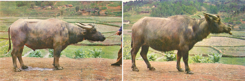 被毛青色,青灰和褐灰,白色极少。头大小适中,角粗,向外向后向内弯曲,呈半弧形。胸宽深,肋骨拱圆腰短而直,臀部中等长,尾短。不超过飞节。四肢短粗,结实有力。蹄大而圆,质地坚实。 |