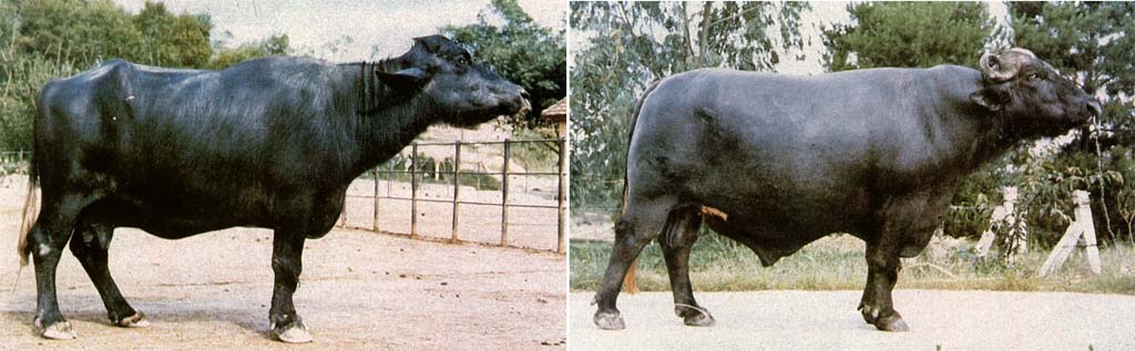 体躯侧呈楔形,皮肤被毛为黑、棕色,头长角短,角基粗,自基部向后放在朝上紧紧卷曲螺状。体躯深厚,躯架较低,体格粗壮,前躯较窄,腹垂较大。后躯宽广。腹较大,前额突出,玉石眼,鼻孔开张,尾主长,母牛乳房发达。 |