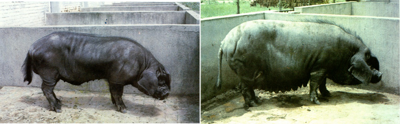 体型较大,头型分“狮头型”和“马脸型”,前者头面短而微凹,后者头面长直,前者体质更粗大,耳大下垂,背腰平直或稍拱起,体躯较长,四肢高而直立,尾根粗而擢升位置较高,成年猪大腿内侧皮肤有较深的皱褶,被毛全黑。 |