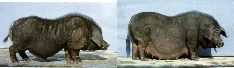 体型大,头中等,较平直,额狭有皱纹、多为横斜行、横路深,耳大下垂,颈粗短,胸宽深,背宽广微凹,腰稍长,后躯较高,腹部疏松下垂,臀倾斜,四肢较短,飞节稍靠拢,被毛黑色,皮有皱褶。 |