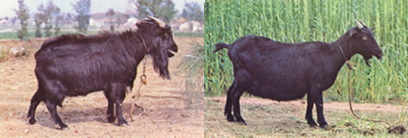 毛色以全黑为主,亦有少数褐色。体躯结实,四肢健壮。头狭长,呈三角形,有髯有角,角向后侧弯曲,公羊角较粗大。背线平直,体躯前低后高,尻部倾斜,尾短小上翘。 |