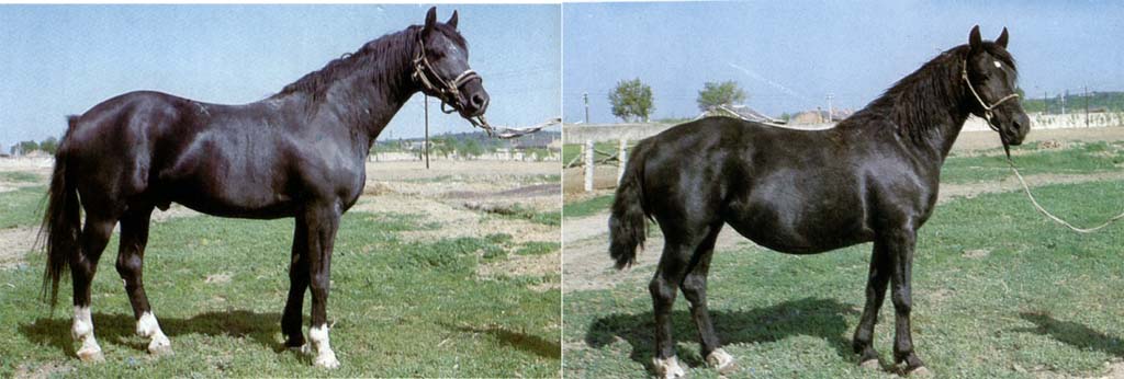 体质结实,头中等大,干燥。颈较长,公马稍呈鹤颈,颈础、较高。鬐甲明显,前胸较宽,胸廓较浅,背较长,腰短,尻较长,呈圆尻,四肢坚实,干燥,关节较大,轮廓明显,前膊和胫较长,蹄质坚实。毛色以青毛为主,黑毛和栗毛次之,骝毛较少。 |