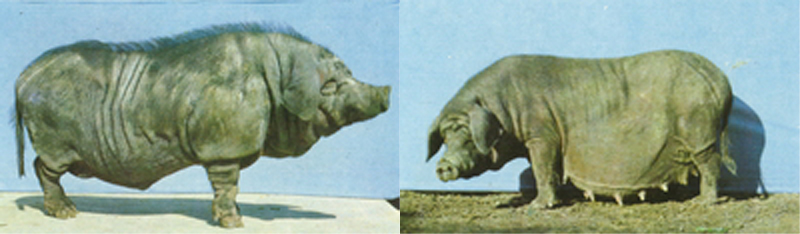 分为粗糙结实型和细致结实型两类,前者耳大而下垂,头大、额宽,半双背胸开宽,腰部较平直,四肢粗壮结实,后者耳较小而下垂,头较小,软腰明显,四肢细致结实。毛色全黑。 |