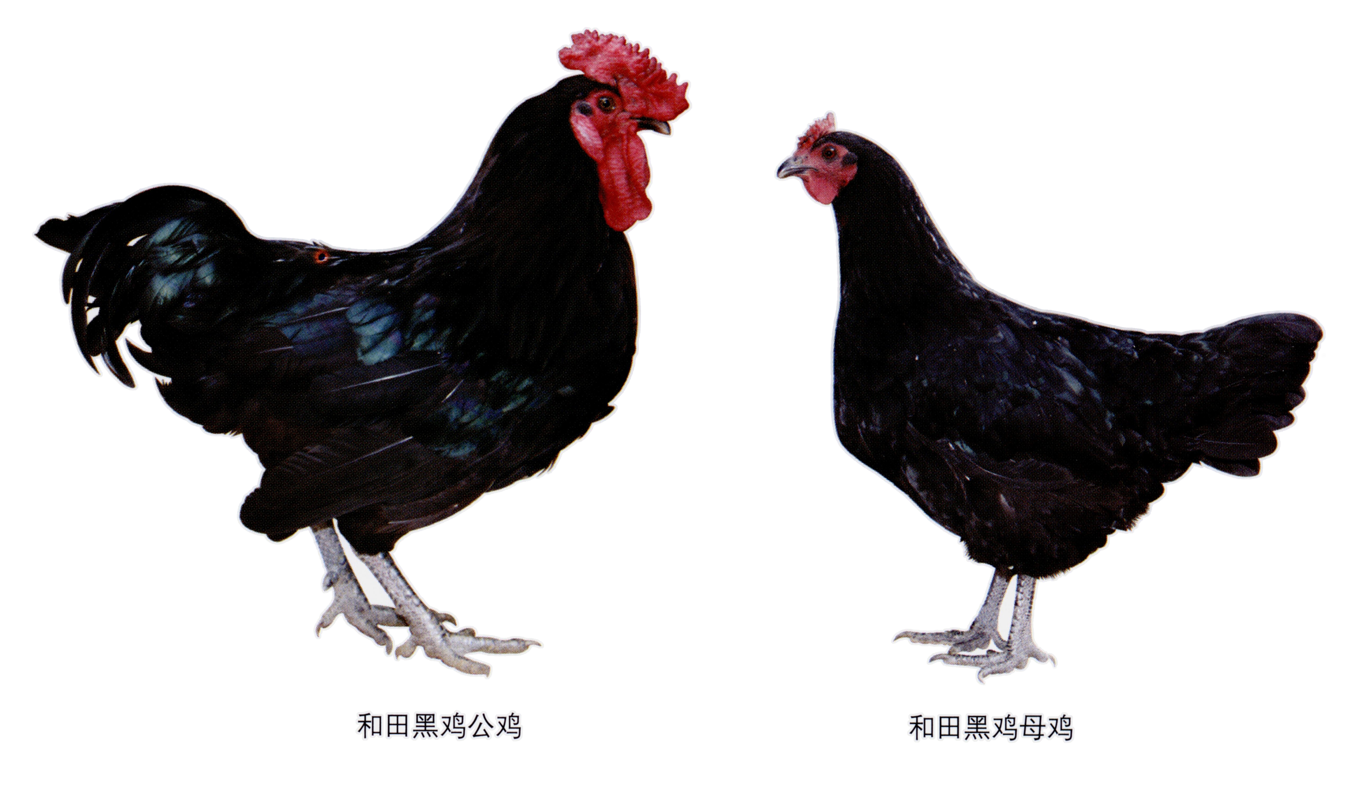 | 其它特征 | 和田黑鸡羽毛黑色,喙呈黑色。冠、肉髯多呈深红色,少数呈紫色。耳叶呈红色。虹彩呈褐色。胫呈黑色或青绿色,少量有胫羽。多四趾,少数五趾 | 体斜长 | 公鸡:21.4±0.9 母鸡:18.8±1.2 |