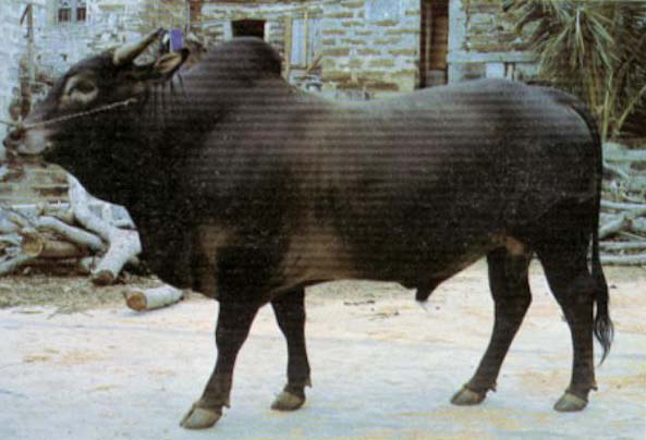 | 体貌概述 | 头长短适中。额平。角基粗圆,角呈倒八字,多向外伸。颈粗短而肉垂发达。公牛肩峰明显。胸深而宽,胸围较大。背腰平直。肋骨弓张。尻部稍斜。肌肉发达。四肢粗壮,蹄质坚实。母牛乳房结构匀称,四肢矮细,个体稍小。毛色分黄、棕、黑色三种。一般母牛多为黄色,公牛多为黑色,腹下及四肢下部颜色较浅,略呈白色,尾扫黑色。角多为黑色,也有琥珀色,鼻镜呈黑色的较多,少数肉色。全身被毛细密,柔软而富光泽。皮肤坚实而有弹性。 | 体型 | 颈粗短而肉垂发达。公牛肩峰明显。胸深而宽,胸围较大。背腰平直。肋骨弓张。尻部稍斜。肌肉发达。四肢粗壮,蹄质坚实。母牛乳房结构匀称,四肢矮细,个体稍小。 |