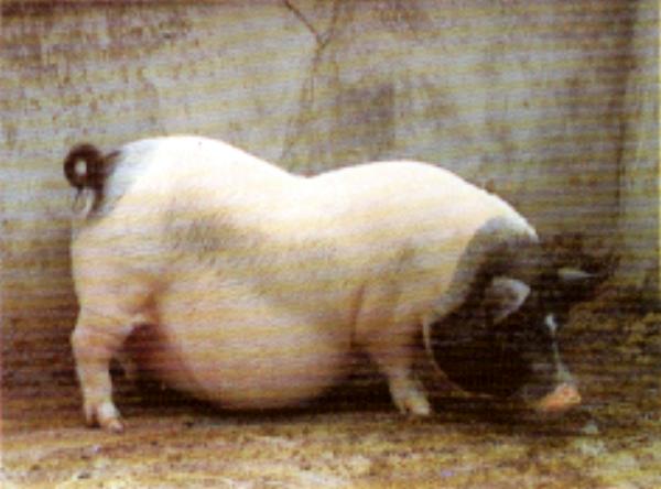 | 体貌概述 | 体型:小、矮、短、圆、肥。头轻小,嘴细长,多数猪的额平而无皱纹,有的个体眼角上缘有两条平行浅纹,耳小而薄。颈短粗。背腰稍凹。胸宽圆。腹下垂,多触地。前肢直,后肢卧系,四肢细。头至颈部前1/2或1/3处及臀部为黑色,脸正中有白斑或白线伸至鼻端。部分猪只在背腰间有大小不等的黑斑。黑色交界处有黑底白毛灰色带,被毛纤细柔软,尾长过飞节。尾端毛呈鱼尾状。 | 体型 | 体型:小、矮、短、圆、肥。头轻小,颈短粗。背腰稍凹。胸宽圆。腹下垂,多触地。前肢直,后肢卧系,四肢细。 |