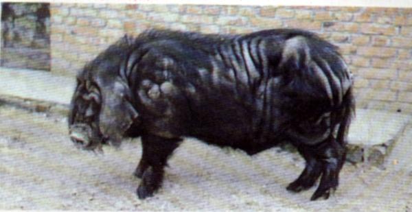 | 体貌概述 | 分大耳猪和小耳猪。前者体格中等,耳大下垂,一般达嘴角叉下,但不超过鼻端。面直或微凹,嘴筒粗长,俗称“黄瓜嘴”。额部有菱形或寿字形皱纹。背凹、大腹,四肢粗壮。被毛粗,全黑,鬃长、耳尖多而长。后者体格略小,结构匀称。耳小下垂一般可达嘴角。面直或稍凹,额部亦有菱形或川字形皱纹,但浅而细。背腰较平,臀部丰满。腹大不拖地,四肢坚实,皮薄骨细,被毛黑色较稀,鬃毛粗长,尾毛较多,形似马尾。 | 体型 | 分大耳猪和小耳猪。前者体格中等,背凹、大腹,四肢粗壮。后者体格略小,结构匀称。背腰较平,臀部丰满。腹大不拖地,四肢坚实,皮薄骨细。 |