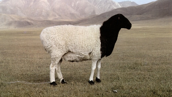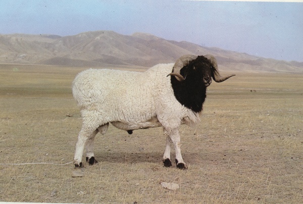 | 体型 | 体质结实,体格中等。后躯较前躯发达。四肢较高,蹄质致密。尾属短脂尾不超过飞节。 | 毛色 | 头和颈部为黑毛,体躯为白色。毛被属异质毛,干死毛含量较多。 |