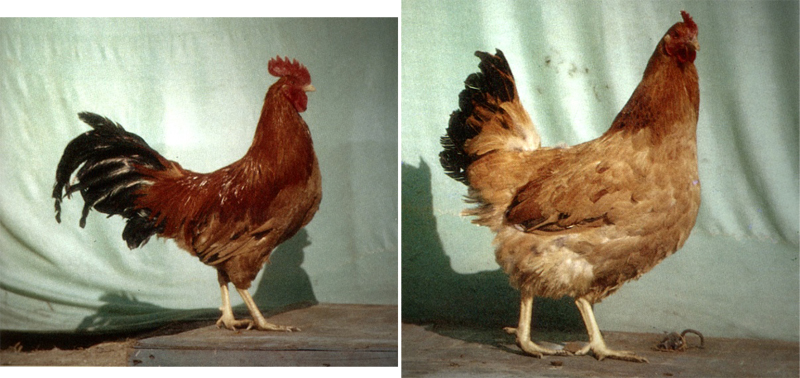 体型魁伟,胸深且广,背宽而长,腿高粗壮,腹部丰满,墩实有力,公鸡羽毛棕红色,尾羽黑色并带金属光泽。母鸡多呈麻黄色,头颈粗壮,眼大明亮,单冠,冠、耳叶、肉垂均呈红色。喙、胫、趾均呈黄色。 |