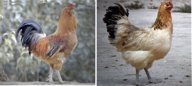 体格中等,胸部发达,背宽而长,腈粗壮而有力。成年公鸡羽色不一致,主要有红公鸡和黑红公鸡。成年母鸡羽色较杂,有黄鸡、黑鸡、白鸡、花鸡等,以黄鸡和麻鸡最多。冠型多为玫瑰冠,少数为单冠。喙多呈灰色。虹彩以橘红色为主。胫灰色,少数个体有胫 |