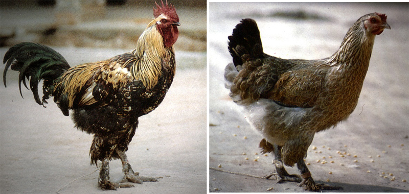 体型高大。骨骼粗长,胫较长,肌肉发达,体躯宽而深。公鸡羽毛多呈赤红色,有光泽。母鸡的翼羽、尾羽全黑,体躯、其他部分则披有新月形条纹的花白羽毛。单冠,红色、直立、前小后大。喙黑色。胫与喙的颜色一致。多数有胫羽和趾羽。皮肤白色。 |