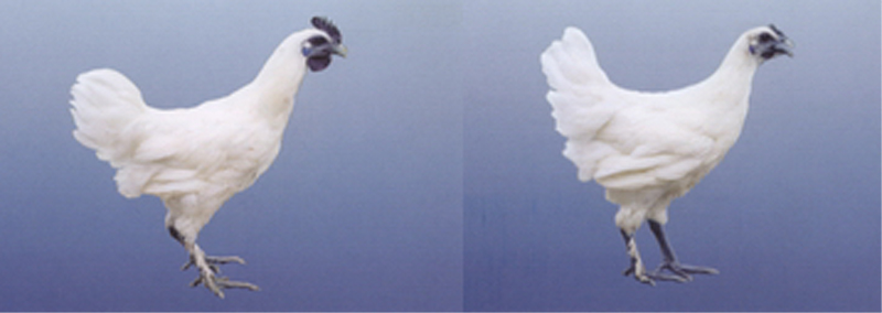 体形中等,呈三角形,全身羽毛洁白,乌喙、乌舌头、乌趾、乌腿、乌皮、乌骨。单冠直立,肉髯发达,均呈绎色,耳垂雀绿色,胫部多数有毛,四趾一距。 |