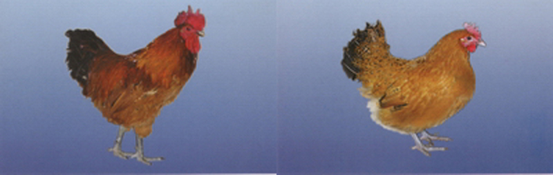 体型较大,体质结实,体躯丰满,胸深背宽,前躯发达呈方形,单冠直立,虹彩橘红色,喙、脚铁青色,母鸡羽毛麻黄色,公鸡羽毛金红色,主尾羽墨绿色。 |
