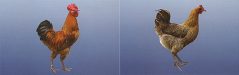 体形较小,羽毛紧贴,体躯窄、浅而短。单冠小而薄、冠、耳、脸红色,虹彩黄褐色,喙、脚铁青色。公鸡羽毛金红色,主翼羽及尾羽黑色有青铜光泽,母鸡羽色麻栗色,主翼羽及尾羽色黑而发暗。 |