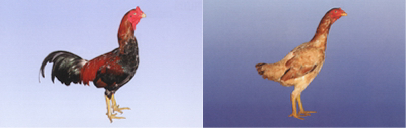 体型分为四种,粗糙疏松型、细致型、紧凑型、细致紧凑型。头半棱形,冠有平冠、鹅冠、花冠等。羽色以青、红、白三色为主色。胸骨长,脚趾间距比普通鸡宽。 |