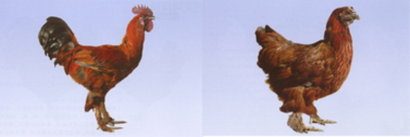 体型较大,似砖块形,其又分为高脚和矮脚型两类。多为单冠,少数豆冠,虹彩栗色,肉垂红色或紫色。喙、胫黑色,多数有胫羽,趾羽发达,皮肤白色、灰色或黑色。母鸡羽色以深鹧鸪色居多,黑红色较少,公鸡羽色为红色或黑红色 |