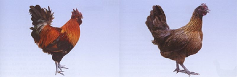 体型矮小,结构匀称,羽毛紧密。头较小,多为平头、单冠,虹彩桔红色,耳垂红色,少数白色,喙黑褐色,胫青黑色。公鸡羽毛深红色兼有红花、黑红和白色,羽毛发达,红公鸡多呈黑绝色。母鸡羽毛以麻黄色为主,兼有黑色、白色,全身皮肤黑色。 |