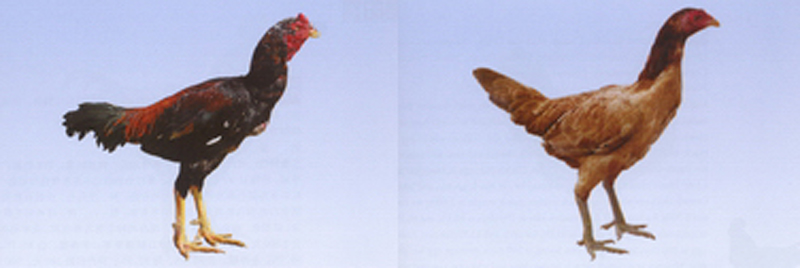 体型高大,体呈方形,羽毛稀少,胸肌裸露,头小呈半梭形,冠,耳较小,鲜红色,多数为短冠。颈较长,喙短粗呈方形,颜色有黄、褐、铁灰等。脸部红色,虹彩橘红色,金黄色。皮肤白色,无胫羽,趾羽。 |