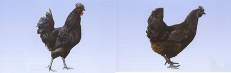 公鸡体大,羽毛贴身紧凑,杯腰宽平,尾羽翘起,体呈长方形,单冠直立,冠、髯、耳垂粗糙,呈红色或紫红色,虹彩黄色或金黄色,皮肤白色或青紫色。喙、胫黑色。公鸡羽毛氛围赤红、黑红、白羽三种。母鸡色杂,皮肤有白色和乌色两种。 |