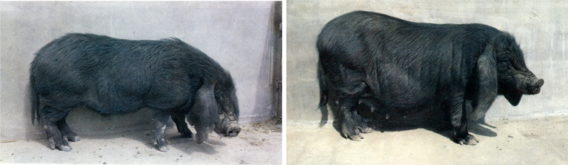 头较狭长,耳大下垂,额有纵行“八”字皱纹,故名八眉。被毛黑色。按体型外貌和生产特点可分为大八眉,二八眉和小伙猪三大类型。前者体格较大,背腰稍长,腹大下垂。四肢稍高,后肢多卧系。后者体型较小,背短宽较平,八眉猪介于二者间。 |