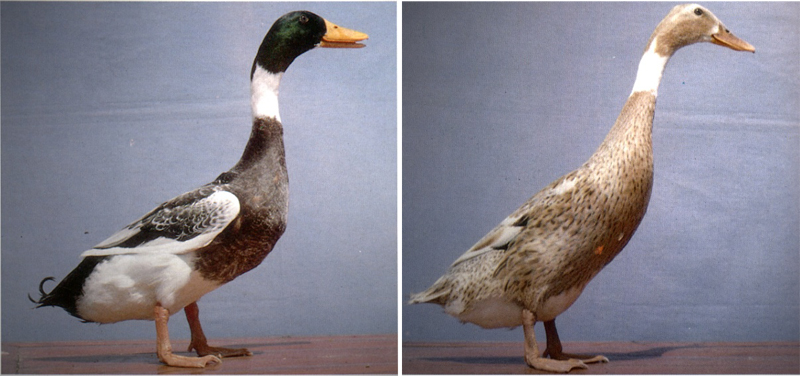 结构匀称,紧凑结实,体躯狭长,喙长颈细,全身羽毛以深褐麻雀色为基色,喙、胫、跖橘红色,皮肤黄色,公鸭头和颈上部及尾羽为墨绿色,有光泽,分颈中间有白圈和无圈两大类型。 |