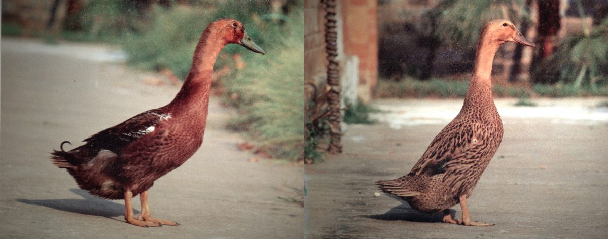 体型中等偏大,头型稍粗,喙青色,皮肤白色,胫、蹼青黄色。公鸭头、颈、背部羽毛红褐色,少数头部有墨绿色羽毛,翼有墨绿色镜羽。母鸭全身褐色,翼有墨绿色镜羽。 |