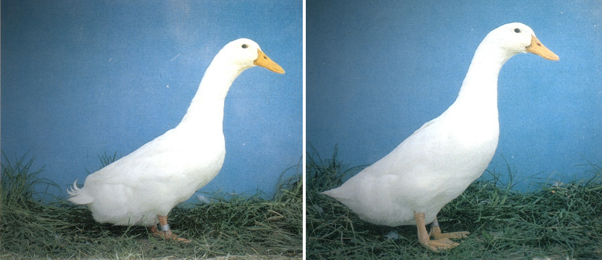 体型硕大丰满,体躯呈长方形。背宽平,胸丰满。肋骨长而直,头大颈粗。全身羽毛丰满,羽色纯白并带有奶油光泽;喙为橙黄色,喙豆肉粉色,胫、蹼橙黄色或橘红色 |