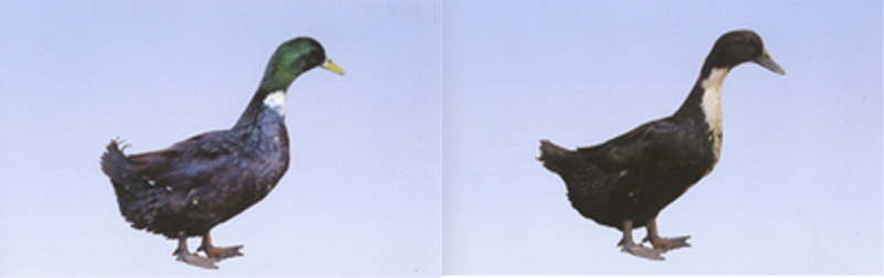 体态匀称,体质细致紧凑。全身羽毛以黑色为主,有“白嗉”、“白翅膀尖”的特征,头呈方园型,眼大有神,虹彩为深褐色,喙以黑色为主,深黑色较少,颈细中等大,蹼为黑色或蜡黄色,全身皮肤浅黄色,公鸭体型较大,头颈羽毛为青绿色,体态匀称。 |