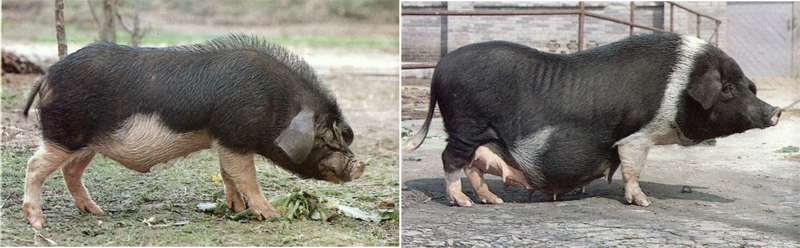 头中等大小,额有深浅和形状不一的皱纹,耳前倾下垂,颈短厚。背腰宽,且多凹陷,腹大下垂,臀宽而稍倾斜。毛细稀短,毛色不一。 |