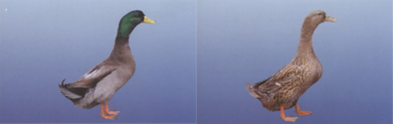 公鸭胸深,体躯长方形,头颈上半段为深孔雀绿色,有的有一白环,体羽深褐色,腹羽灰白色,尾羽黑色。母鸭羽毛紧密,胸腹丰满,臀部方形,全身麻色带黄,黑斑纹。 |