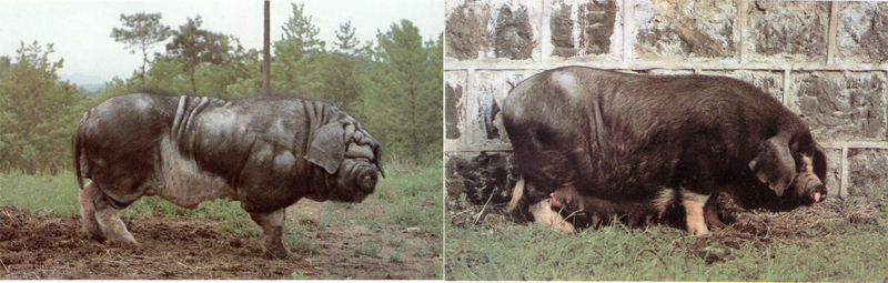 头中等大。耳大而厚,垂向前下方,面微凹,额部皱纹多呈菱形。颈较细,胸较宽,背腰多平直,腹下垂。四肢粗壮,大腿不够丰满。尾尖扁平。体躯皮肤有皱褶。被毛有“全黑”“大花斑”和“六百”三种。 |