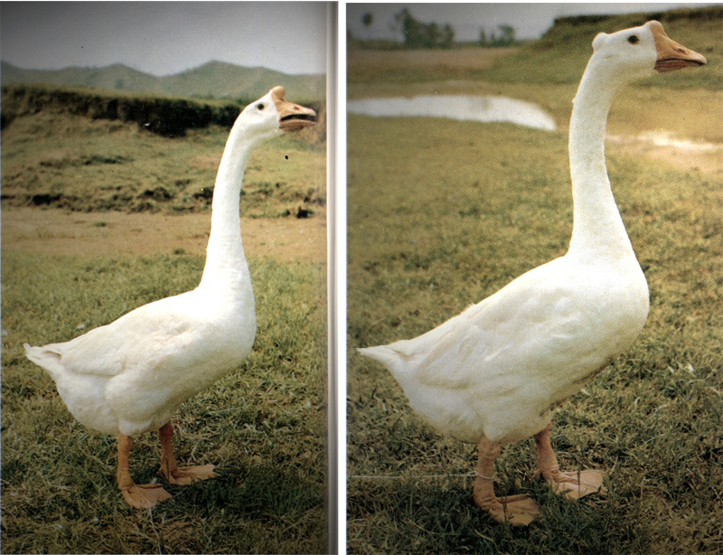 体型高大,体躯稍长,呈圆柱形,体质结实,羽毛着生紧密,体躯稍长,有白、灰两种颜色。公鹅有明显的肉瘤。母鹅肉瘤扁平,大部分无咽袋,胫、蹼橘红色,皮肤浅黄色,虹彩蓝灰色。母鹅腹部下垂,有腹褶。 |