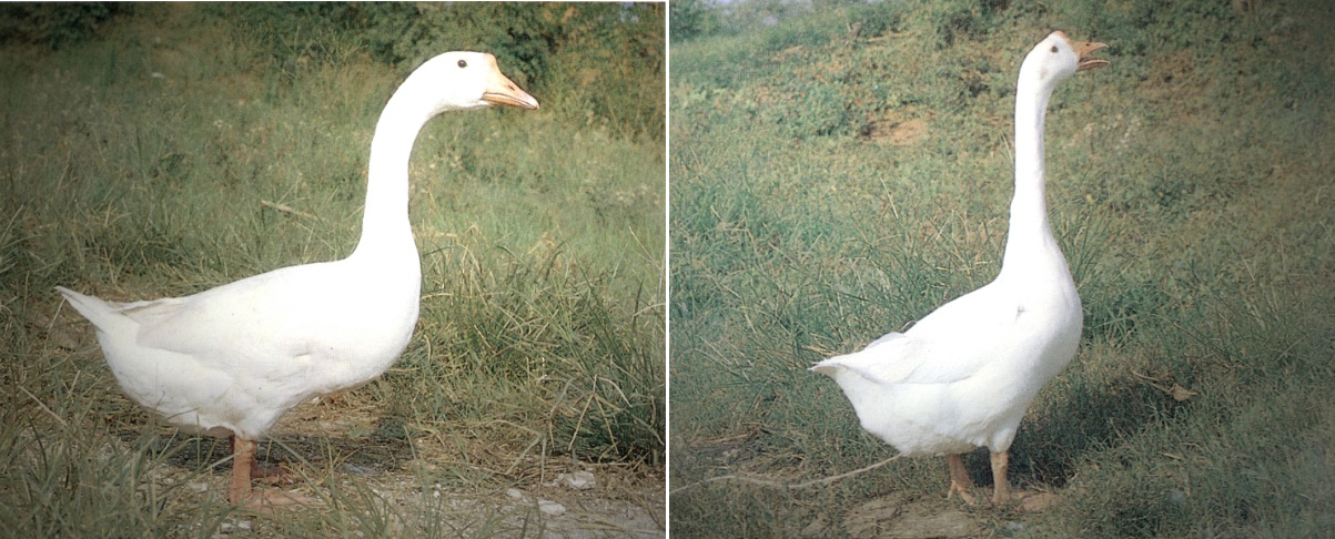 体型较小,体态高昂,体质细致紧凑。,全身羽毛洁白,偶尔眼稍、头颈部、腰背部出现少量灰褐色羽毛。喙、胫、蹼橘红色,爪白色,虹彩灰蓝色。肉瘤淡姜黄色。无咽袋,偶有腹褶。 |