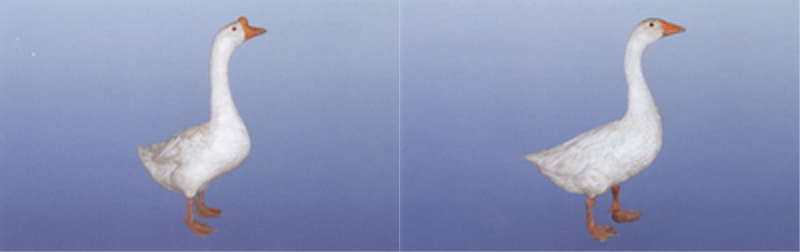 体型小,紧凑,略呈长圆形,颈细长,头上额包较小,多数都顶有缨。眼虹彩为灰色。喙胫和蹼鬐为橘黄色,颈下垂皮较下,腹部不下垂。全身羽毛白色。 |