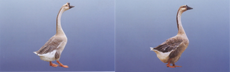 体型中等,蛋肉绒兼用、尾翅膀羽毛为灰色。胸部深宽且丰满,腹部宽大而扁平。皮肤白色,胫、蹼橘黄色。公鹅颈粗长,肉瘤高大而向前突,母鹅肉瘤扁平。 |