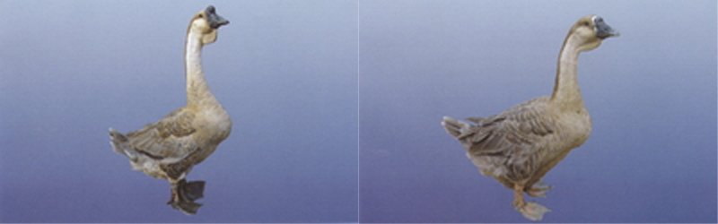 小型肉用鹅种,背胸宽广,腹部均下垂,头部肉瘤较下而平。按羽色分白鹅和灰鹅两类型。胫、蹼分别显橘红色和橙黄色,颈两侧与下方直至腹部都生白羽。主翼羽前两根为白色,后八根为深灰色镶白边。虹彩黄褐色,喙黑色。 |