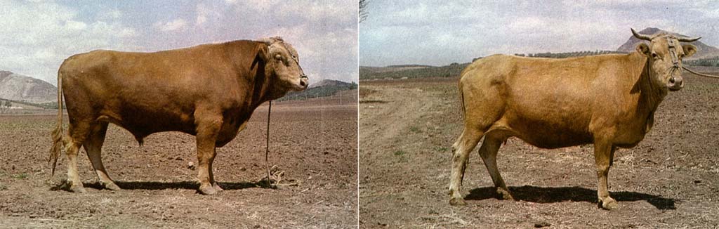 体质结实。胸部深宽,骨胳坚实,被毛长而密,皮厚而有弹力。公牛头方额宽,母牛头大小适中。公牛角基粗大,多向外后方伸展,木牛多龙门角。毛色多呈深浅不同的黄色,黄75%,深黄16%,浅黄7%,其它占2%,被毛长而密。 |