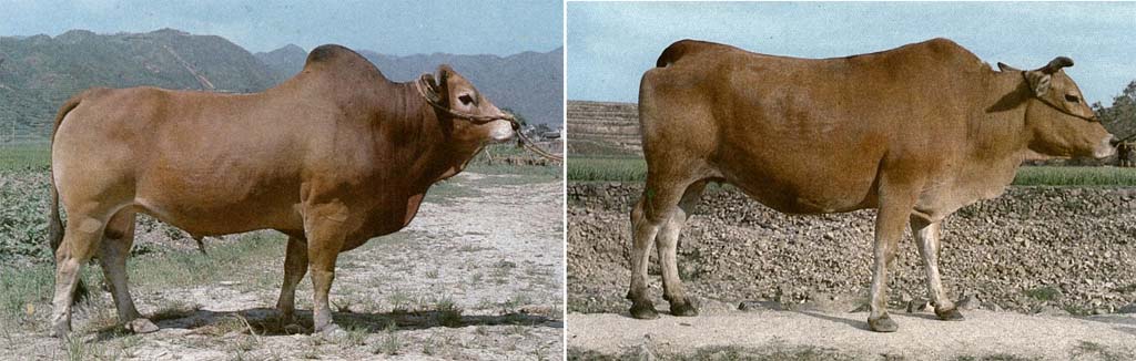 肩峰高耸,前躯发达,肌肉结实,骨骼粗壮,但后躯肌肉欠丰满。公牛颈粗大,肉垂发达,颈侧皮肤略皱褶。母牛颈与前胸结合良好。公牛角呈横担角或龙门角;母牛角细短,耳向前竖立薄而大,毛色为黄、棕黄色。 |