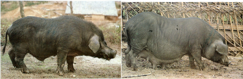 头中等大,面稍长微凹,额部深浅不一的皱纹。耳中等大,前倾下垂。颈短背宽,背腰平直或微凹,臀宽丰满。四肢较细且结实。毛稀而短。被毛黑色,有的呈黑色,有的具有“六白”或不完全“六白”特征。 |