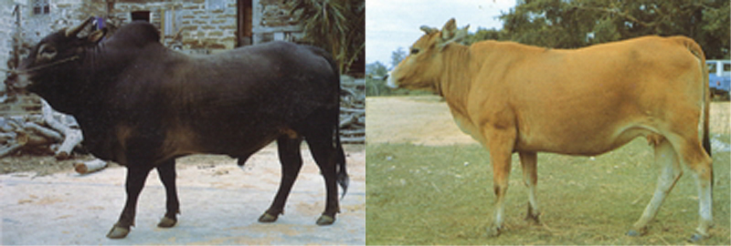 被毛分黄、棕、黑三种。头长短适中,额平,角基粗圆,角呈八字。颈粗短而肉垂发达。公牛肩峰明显,胸深而宽,背腰平直,尻部倾斜,四肢粗壮,肌肉发达。母牛四肢矮细。 |