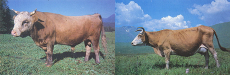 体格中等大小。头部呈白色,体躯主要呈红褐色,腹、胸、乳房、后肢和尾尖等部位呈白色。无角牛占多数。头较重,额较宽,鬐甲宽圆,胸深腹大,尻长宽适中,四肢粗壮,蹄质坚实。 |