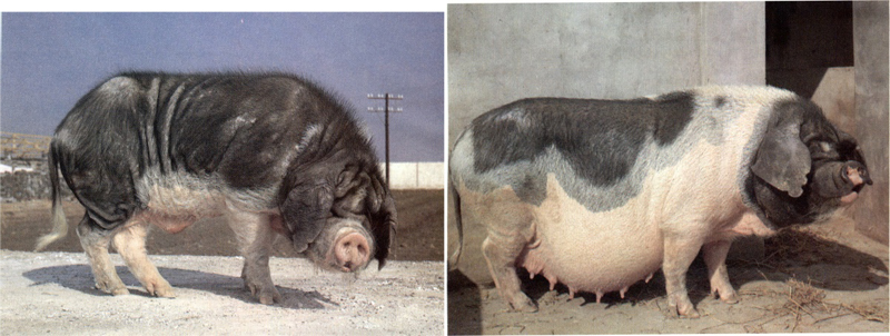 体型中等偏大,头大,额有皱纹,耳中等大,下垂,背腰较平直,腹较大不下垂,毛色都是黑白花,在吻突、四肢下端、前胸和下腹部微白色,头臀两端微黑色,额部有形状和大小不一的“白毛星”。分狮头型,马脸型和桩头型。 |